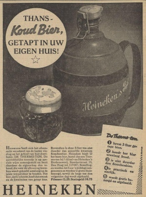 Heineken heeft zich het alleenrecht verzekerd van de laatste vinding op het gebied van bier-distributie: DE THERMO-TON. Dit aantrekkelijke tonnetje is op speciale wijze samengesteld en bezit daardoor de eigenschap den inhoud, die vóór de aflevering kosteloos wordt gekoeld, urenlang op de juiste temperatuur te houden. Het bier, dat U schenkt, heeft den smaak en de kwaliteiten van getapt bier-. Bovendien is deze 3-liter ton niet duurder dan eenzelfde kwantum flesschenbier. Heineken biedt U het beste bier, bestel dus een Thermo-ton bij 't filiaal van Heineken's Bierbrouwerij, Stamkartstraat 10, Den Haag (tel. 117447). Bestellingen worden tot 5 uur 's middags aangenomen en worden U gratis thuisbezorgd, terwijl de leege ton den volgenden dag wordt afgehaald. Pilsener f 1.25. Statiegeld f 0.75