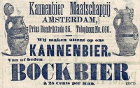 - Deze vraag is oogenschijnlijk gemakkelijk te beantwoorden en hoewel we reeds een succesvolle maand achter onzen rug hebben, zijn er toch nog vele bierdrinkers, die niet weten wat Kannenbier is en zich daarvan eene verkeerde voorstelling maken. Niet het Bier wat we leveren, is iets nieuws, want de etiquetten en onze prijscouranten bewijzen reeds, dat we Amstel bier en van de buitenlandsche Bieren echt Münchener Pschorr" en echt Pilsener Bier van het Bürgerlicbes Brauhaus leveren. Nieuw is daarentegen niet alleen de verpakking, d. i. de kan, waarvan de constructie met groote moeilijkheden gepaard gaat, maar ook eene hoofdzaak de wijze van vullen met koolzuur, nadat de kan luchtdicht is gemaakt. De bierdrinker heeft daardoor de zekerheid dat hij bier te drinken krijgt dat in alle opzichten gelijk is aan bier van 't vat en dat verre boven het flesschenbier te verkiezen is, omdat het langer goed blijft en beter smaakt. In de gebruiksaanwijzing hebben wij er reeds op gewezen, dat het bier niet te koud gedronken moet worden, want bier, dat te koud is, resorbeert te veel koolzuur en is op het oog dood. Krijgt het bier eenmaal de juiste kamertemperatuur, dan wordt daardoor de koolzuur vrij en het bier laat aan mousseeren niets te wenschen over. Om sneller tot dit doel te kunnen geraken, raden we onzer clënteele aan, de kan voor het gebruik eens even met het deksel naar beneden te keeren en dit ook te doen, wanneer de geheele inhoud niet in één keer wordt leeggedronken. Wat de prijzen aangaat, zoo doen we nog eens opmerken, dat deze lager zijn dan die van bier in flesschen. De bierdrinker heeft er dan ook in elk opzicht zelf het meeste belang bij, wanneer hij zegt: Weg met de flesschen, daarvoor Kannen in de plaats. Door een abuis van den drukker was het formaat van de bestelkaarten te groot en daardoor werden er dan ook door de post eenige aan de afzenders teruggezonden. Dit misverstand is nu evenwel verholpen. Ten einde ons bier ook onder 't bereik van kleinere verbruikers te stellen, hebben wij in alle deelen der stad depots opgericht, waar alle soorten van bieren tegen de oorspronkelijke prijzen, ook bij één enkelen kan te verkrijgen zijn. Wij twijfelen niet of deze practische inrichting zal door de kleinere verbruikers met vreugde worden begroet. Onze zaak heeft in den korten tijd van haar bestaan zulk eene vlucht genomen, dat wij genoodzaakt waren ons Kantoor naar Prins Hendrikkade N°. 21 gebouw Mercurius te verplaatsen, Prins Hendrikkade 86 blijft de expeditie gevestigd. Evenals vroeger blijft ook daar de verkoop aan huis en worden aldaar orders en bestellingen aangenomen. Terwijl wij ons veroorloven nogmaals op de groote zindelijkheid van onzer geheele zaak opmerkzaam te maken, gaven wij onzer geachte cliènteele de verzekering, dat wij hare orders steeds zorgvuldig en prompt ten uitvoer zullen brengen. Van onregelmatigheden in de bestelling of anderszins gelieve men ons in kennis te stellen, bovendien heeft onze looper ten gerieve der klanten voor event. klachten een klachtenboek bij zich. Aan den anderen kant zou het ons zeer aangenaam zijn, wanneer eens voor altijd de dagen werden aangegeven, waarop kan worden gehoord of het Bier kan worden afgeleverd. Wij hopen, dat onze zaak voortdurend in bloei zal toenemen en teekenen